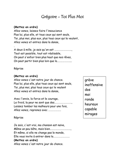 Gregoire Chanson Toi Plus Moi Francais Fle Fiches Pedagogiques